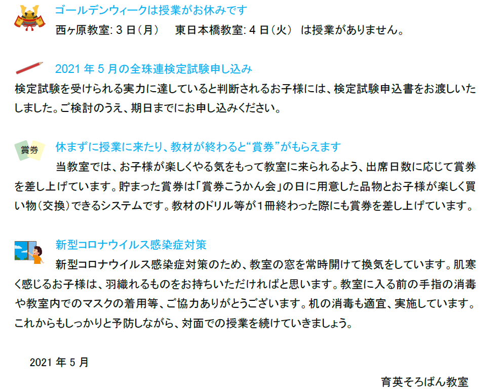 育英そろばん教室で楽しく学習しましょう! 2 教室の入学案内 全国珠算教育連盟 正会員指導教場そろばん無料体験学習受付中!お気軽にお問い合わせください。 住 所東京都北区西ケ原4-14-13 最 寄北区立西ヶ原小学校ならび 入学案内をみる 住 所東京都北区滝野川1-55-7 最 寄都バス・都電(飛鳥山)徒歩1分 入学案内をみる