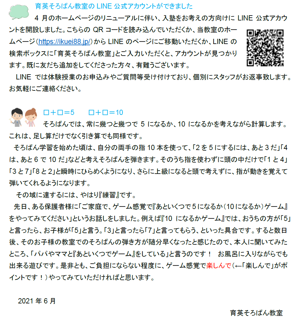 育英そろばん教室で楽しく学習しましょう! 2 教室の入学案内 全国珠算教育連盟 正会員指導教場そろばん無料体験学習受付中!お気軽にお問い合わせください。 住 所東京都北区西ケ原4-14-13 最 寄北区立西ヶ原小学校ならび 入学案内をみる 住 所東京都北区滝野川1-55-7 最 寄都バス・都電(飛鳥山)徒歩1分 入学案内をみる